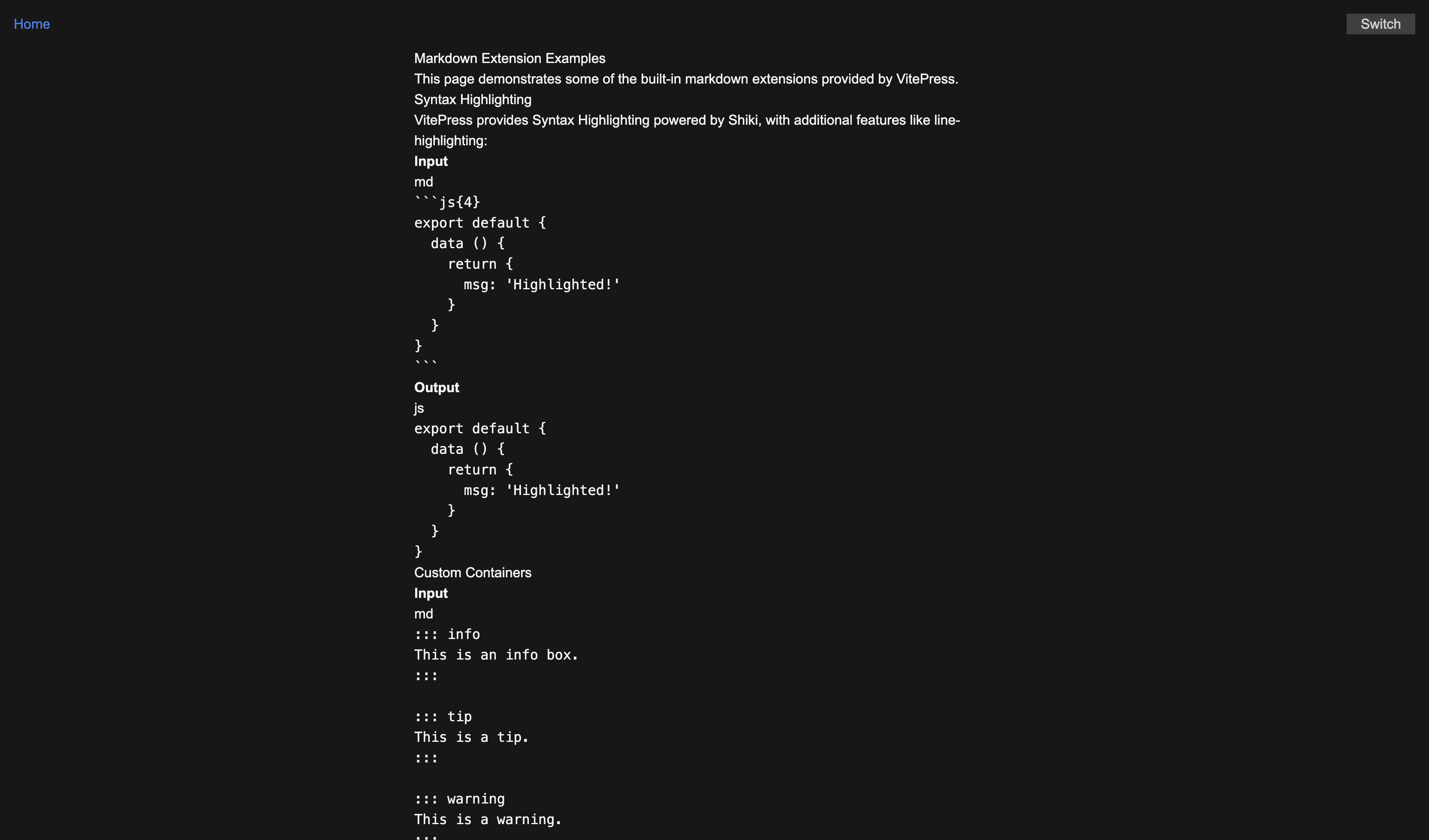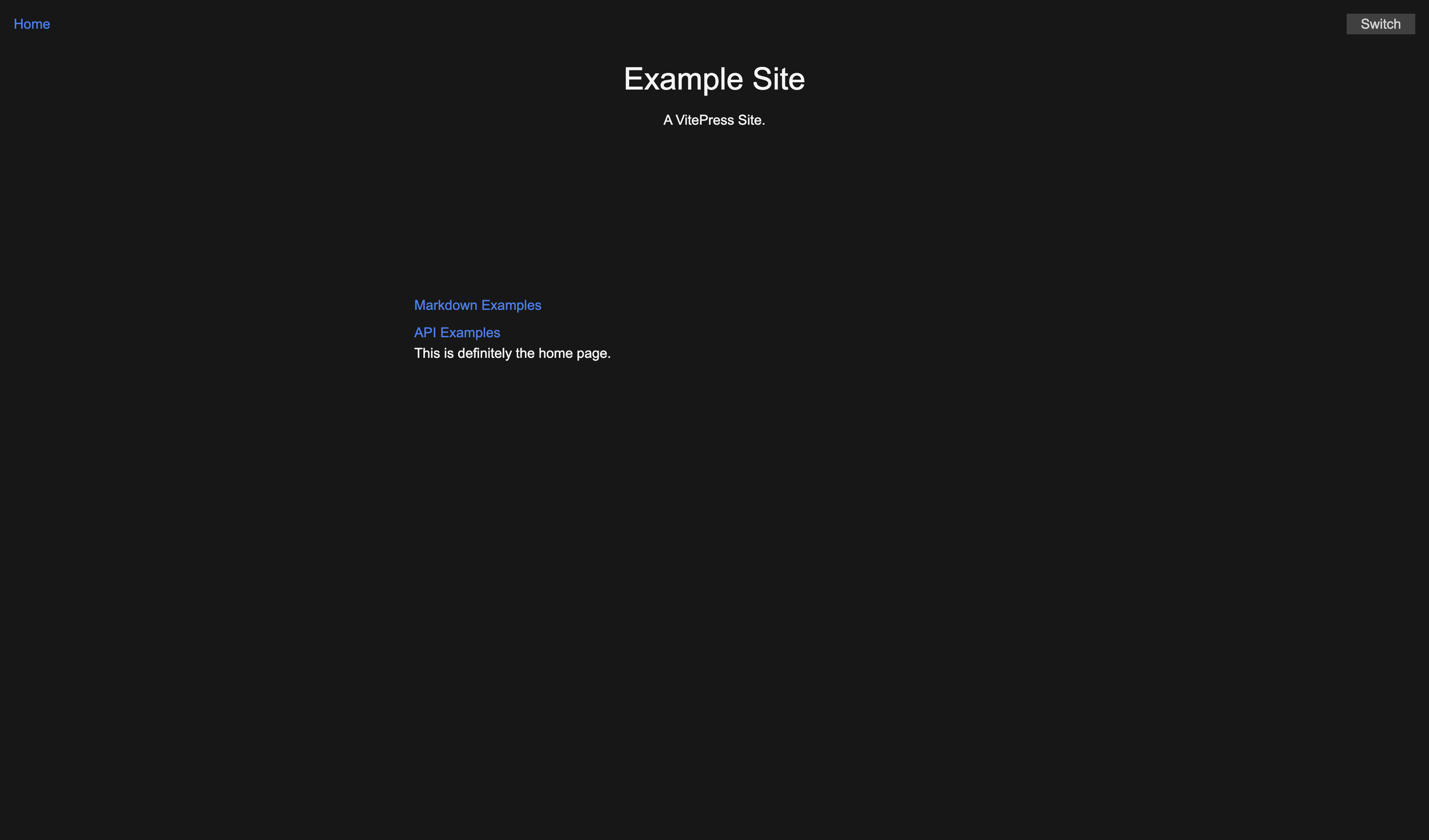 </template>在 <template> 中, 我们可以看到基于 frontmatter.home 的条件渲染。 frontmatter 是 MD 文件的元数据, 这意味着如果当前页面对应的 MD 文件的 YAML 头 (或者 JSON 头) 中有 home: true, 则会渲染 site.title、site.description 等首页内容。 否则,会渲染一个返回首页的链接和 <Content /> 组件。 <Content /> 组件是 VitePress 的内置组件, 用于将当前页面对应的 MD 文件渲染为 HTML。