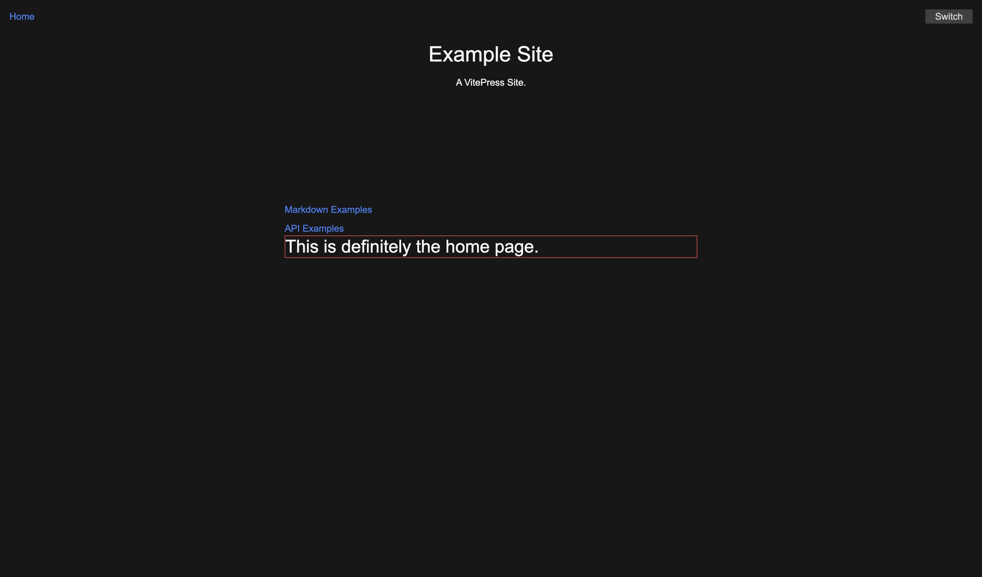 }这样一来, 加载在主页上的 <Content /> 组件的内容就会被添加上 home-page 类名, 从而可以在 style.css 中对其进行样式设计。 这里我们简单地添加了一个红色的边框和大字体样式。