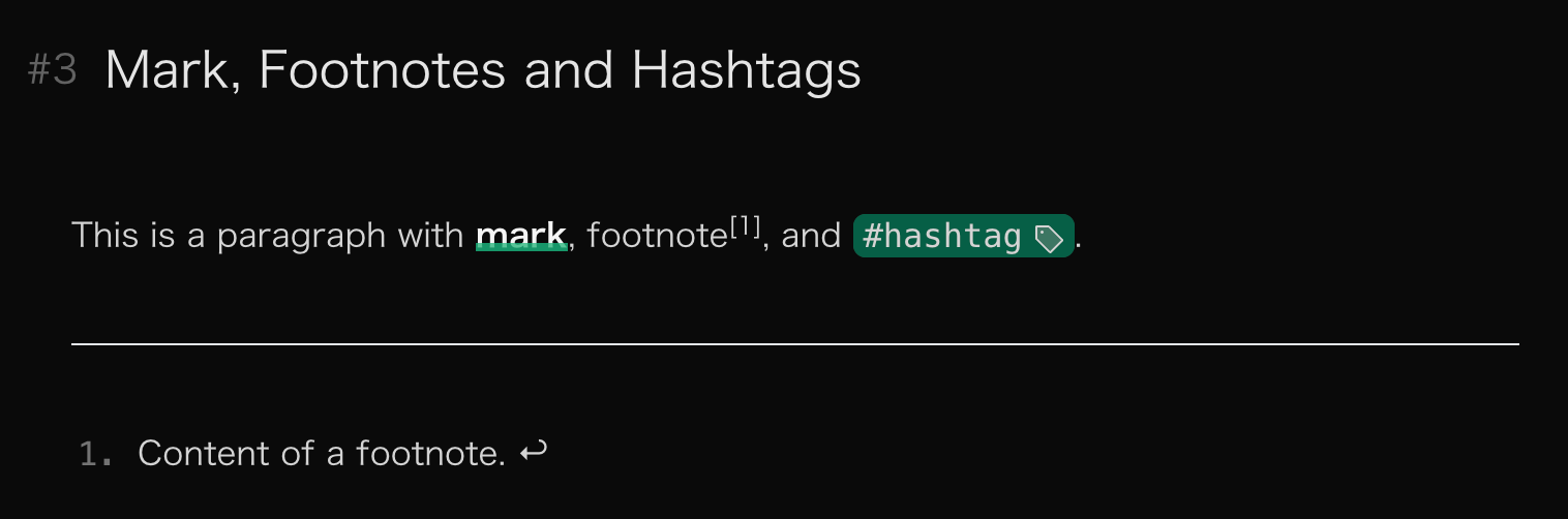 虽然 markdown-it 默认的解析应该够用了, 不过确实还有可以扩展的地方。 比如 [^1] 标记的 footnote、 == 标记的 highlight, 以及 # 标记的 hashtag。
