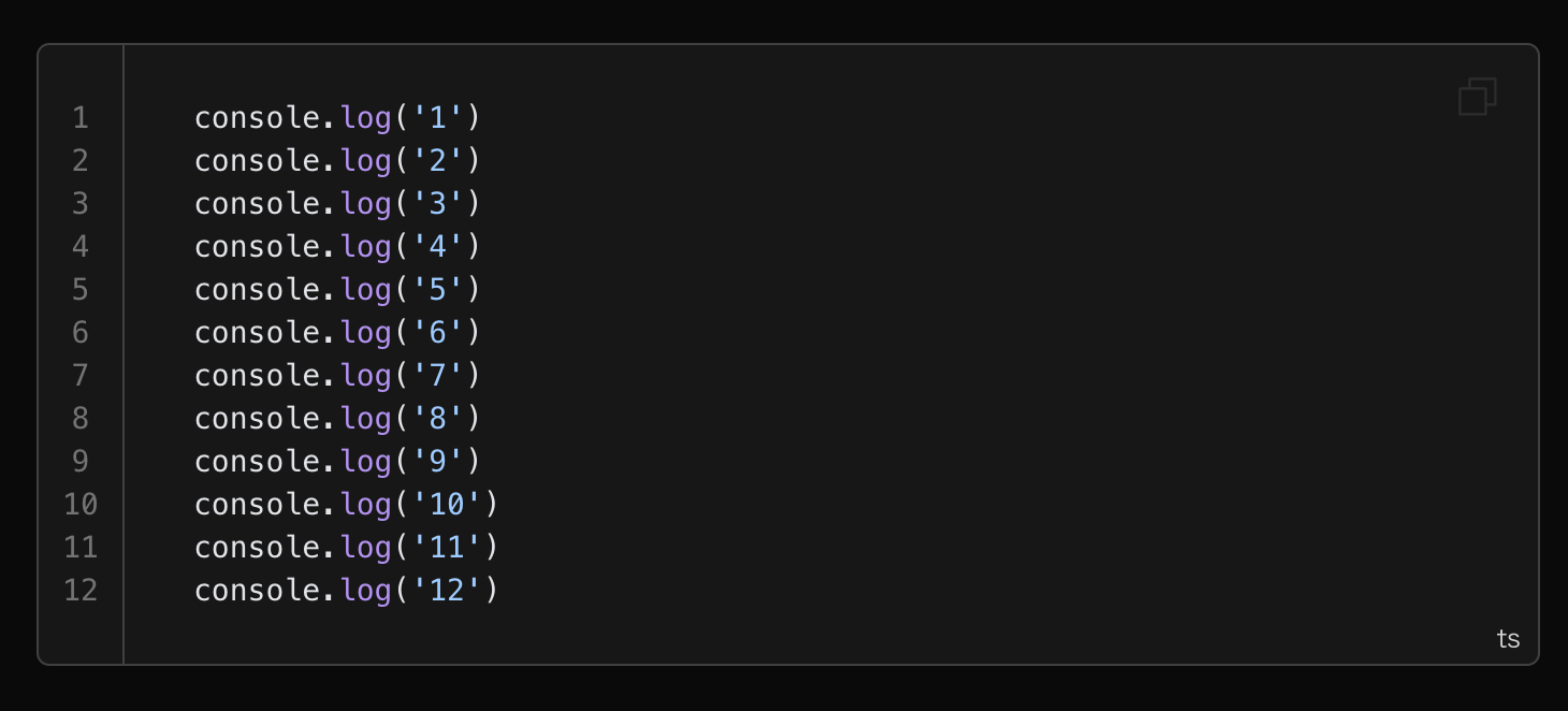VitePress 提供 代码行号的功能。 使用方式请参考文档。 在开启行号后, 代码块长成了这样: