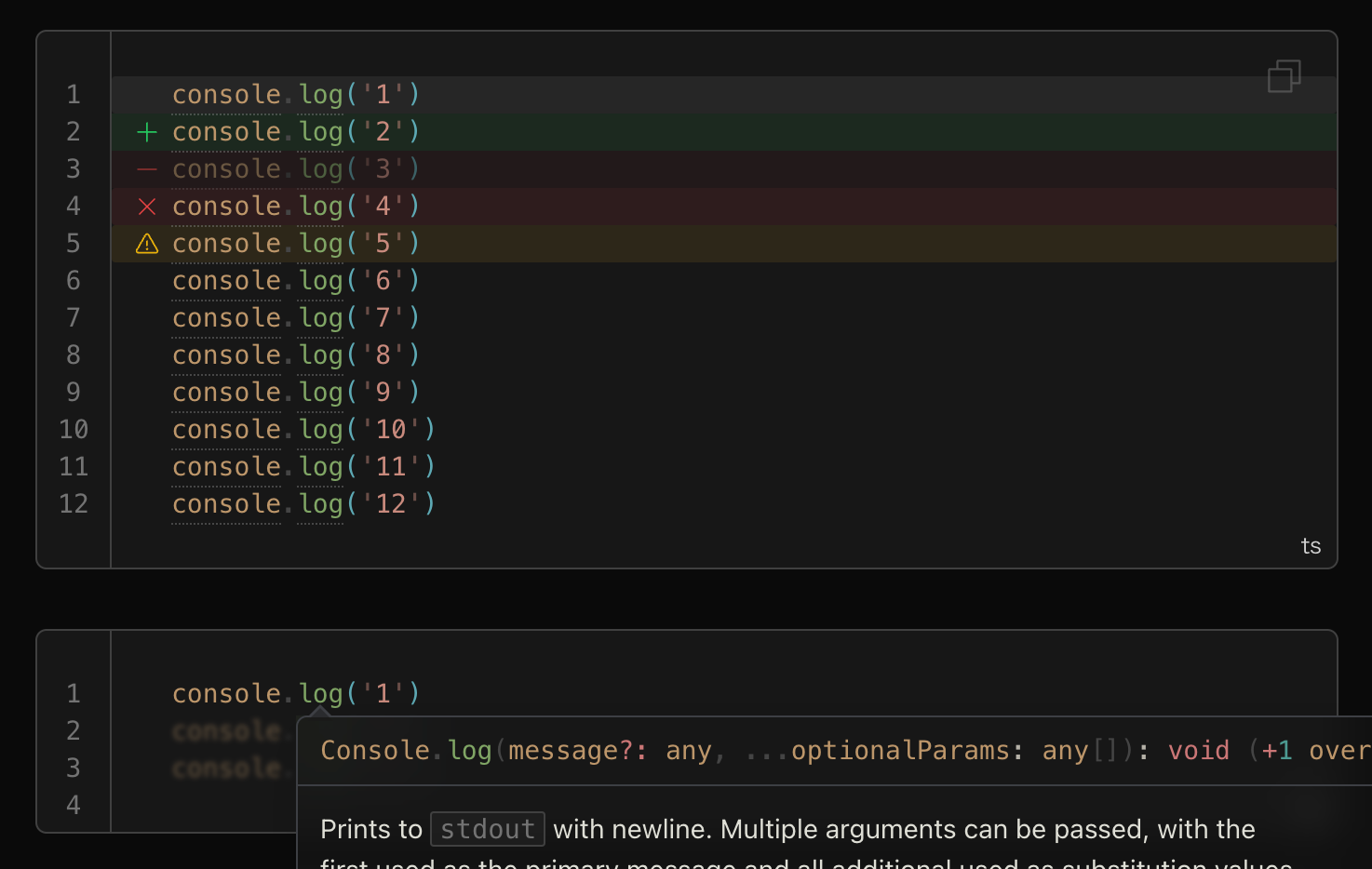 console.log('5') // [!code warning]